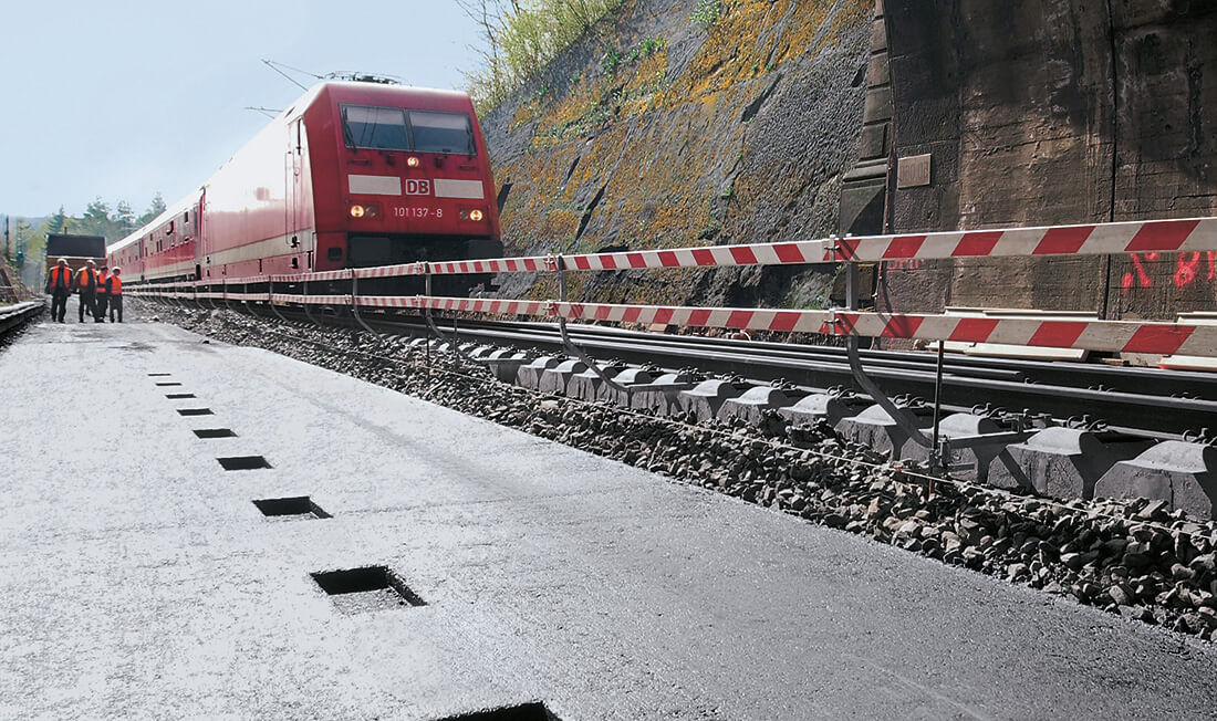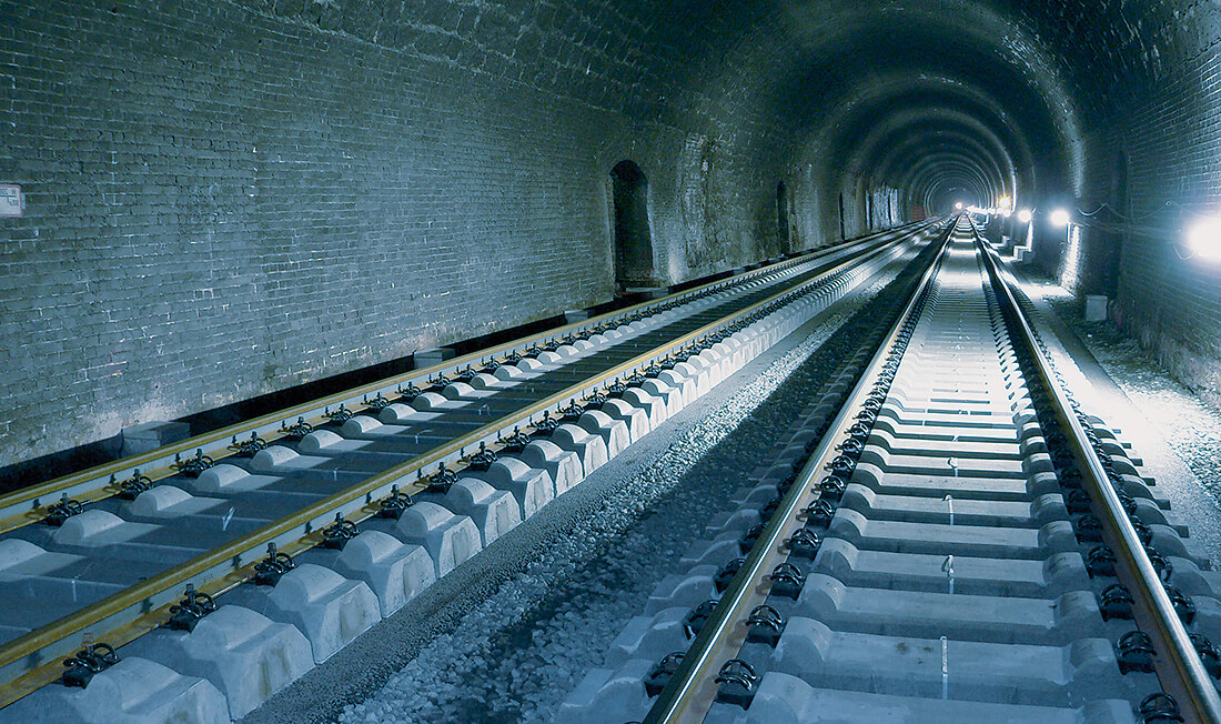 - Für die gut drei Kilometer lange Strecke wurde das Feste-Fahrbahn-System GETRAC® A3 ausgewählt, da es durch seine systemeigenen Breitschwellen eine reduzierte Bauhöhe erreicht und besonders gut für Tunneleinbauten geeignet ist