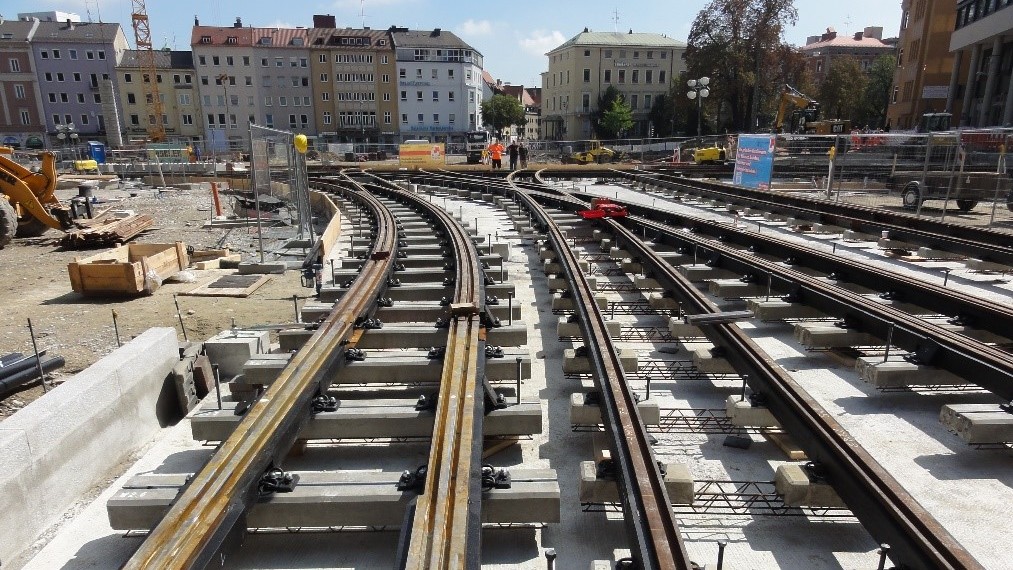 In addition, the RHEDA CITY system has a solution for turnouts of different designs and can also be adapted for special applications such as multi-track systems by using special sleepers. Another special design that is often required in urban areas with historic buildings or with buildings of clinical or cultural use is the design with specially adjusted sound or vibration emission. This can also be implemented by elastic support of the concrete bearing slab - i.e. as a mass-spring system - without further modification of the basic RHEDA CITY system.